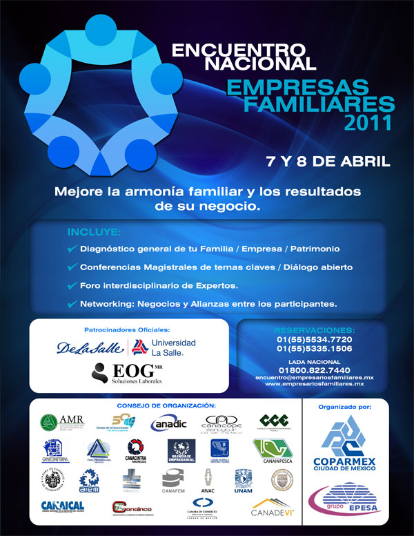 Encuentro Nacional de Empresas Familiares marzo 22, 2011 By Organizado por COPARMEX. Fecha: 7 y 8 de abril de 2011 Lugar: Hotel María Isabel Sheraton Paseo de la Reforma 325, México, D.F. Más información: www.empresariosfamiliares.mx/
